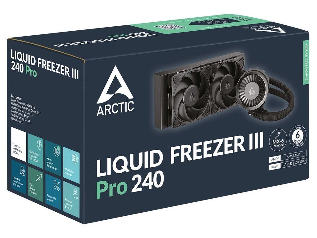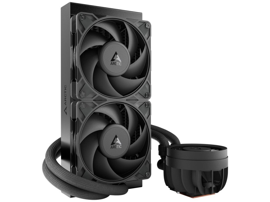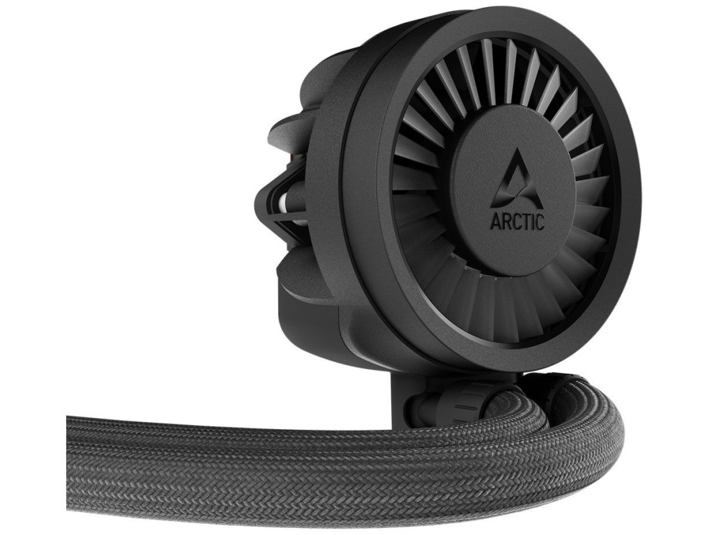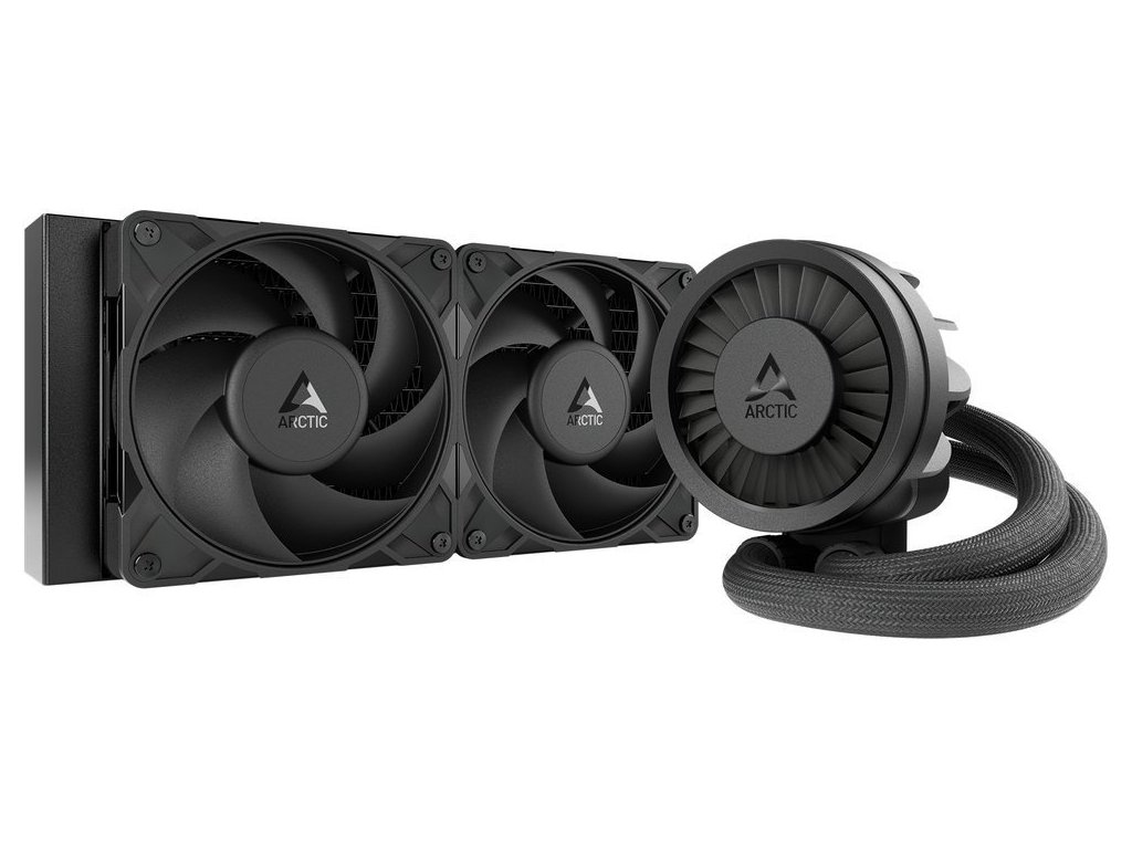 O chlazení se stará 240mm hliníkový radiátor o rozměrech 277 × 120 × 38 mm, který má větší objem než běžné tenčí AiO modely a lépe zvládá teplotní špičky. Dva ventilátory ARCTIC P12 Pro běží v rozsahu 600–3000 ot./min., nabízejí průtok vzduchu až 77 CFM a statický tlak 6,9 mmH2O.