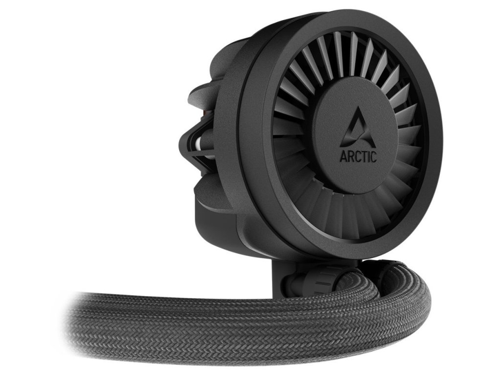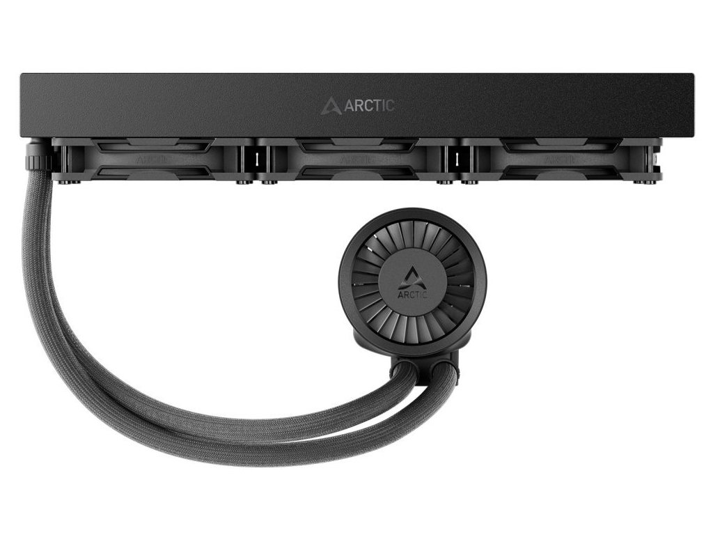 O odvod tepla se stará 360mm hliníkový radiátor o rozměrech 398 × 120 × 38 mm, který má větší objem než běžné 27mm AiO modely a lépe zvládá teplotní špičky. Tři ventilátory ARCTIC P12 Pro pracují v rozsahu 600–3000 ot./min., nabízejí průtok vzduchu až 77 CFM a statický tlak 6,9 mmH2O, takže chladič bez problémů zapadne i do náročnějších herních a pracovních sestav.