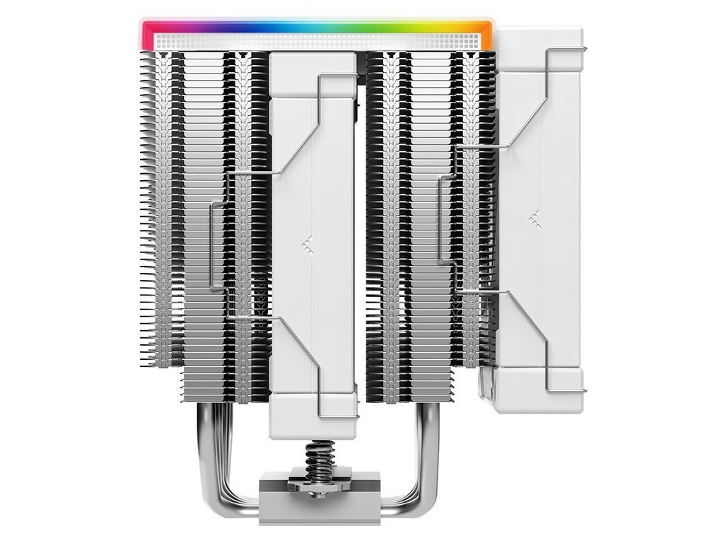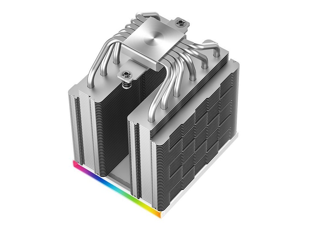 Šest měděných heatpipe, čistě měděná základna a dvouvěžový pasiv s hustými žebry zajišťují maximální odvod tepla i při náročném přetaktování. Dva 120mm ventilátory s technologií Fluid Dynamic Bearing (FDB) a PWM regulací se automaticky přizpůsobují aktuální teplotě procesoru (500–1850 RPM), což umožňuje optimální rovnováhu mezi výkonem a nízkou hlučností do 28 dB(A). Vysoký průtok vzduchu 68,99 CFM a tlak 2,19 mmAq zajišťují efektivní chlazení i při plné zátěži.