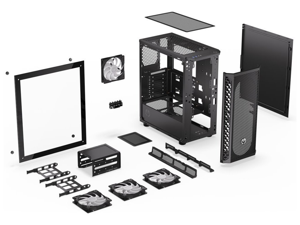 Skříň podporuje základní desky ATX, microATX i Mini-ITX, grafické karty do délky 350 mm a chladiče procesoru do výšky 161 mm. Bez problémů tak zvládne i silnější herní build.