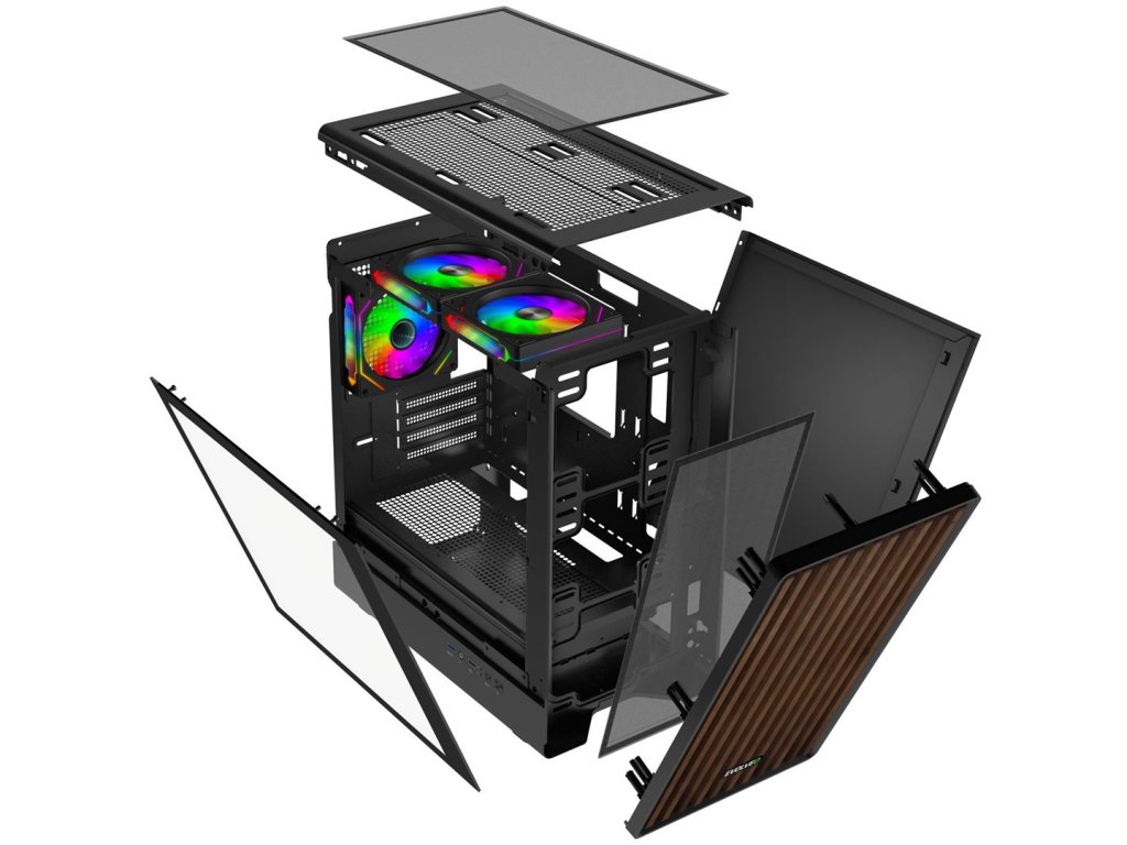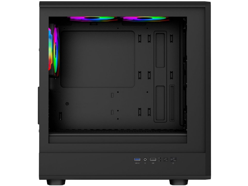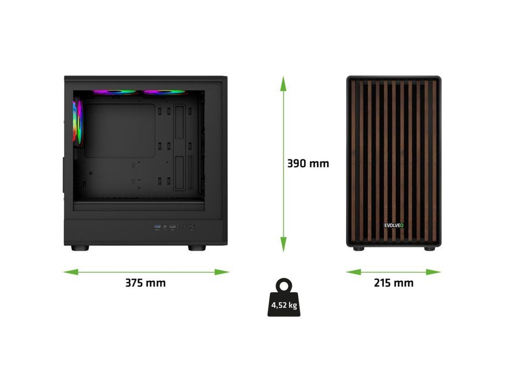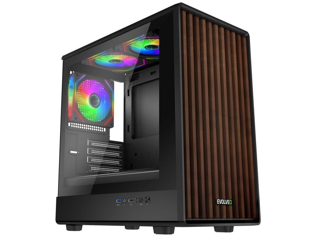 EVOLVEO Panthera je stylová mATX skříň s dřevěným čelním panelem, bočnicí z temperovaného skla a 3 ARGB ventilátory Infinity Mirror pro efektní herní sestavy.