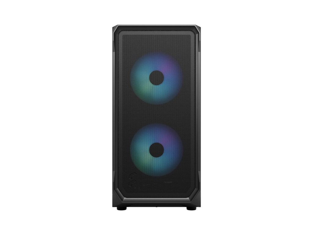 Fractal Design Focus 2 RGB Black TG Clear Tint je vzdušná Midi Tower skříň s mesh čelním panelem, bočnicí z tvrzeného skla a dvěma předinstalovanými 140mm Aspect RGB ventilátory.